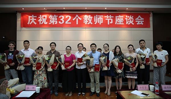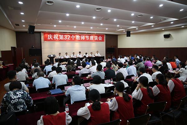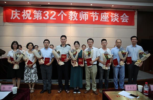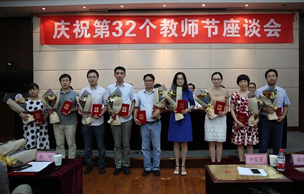9月9日下午,在第32个教师节来临之前,我校在国际交流中心二楼报告厅召开座谈会,庆祝教职工自己的节日,表彰先进集体和优秀个人。校领导朱爱胜、龚方红、谈向群、华坚、冯渊、顾京、周桂瑾,受表彰人员、教职工代表和学生代表等近百人参加了座谈会。